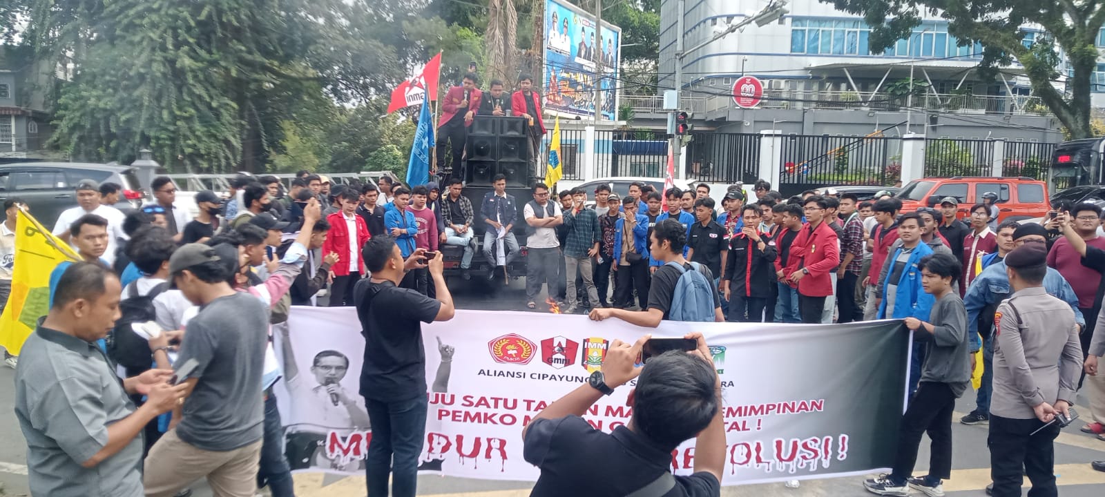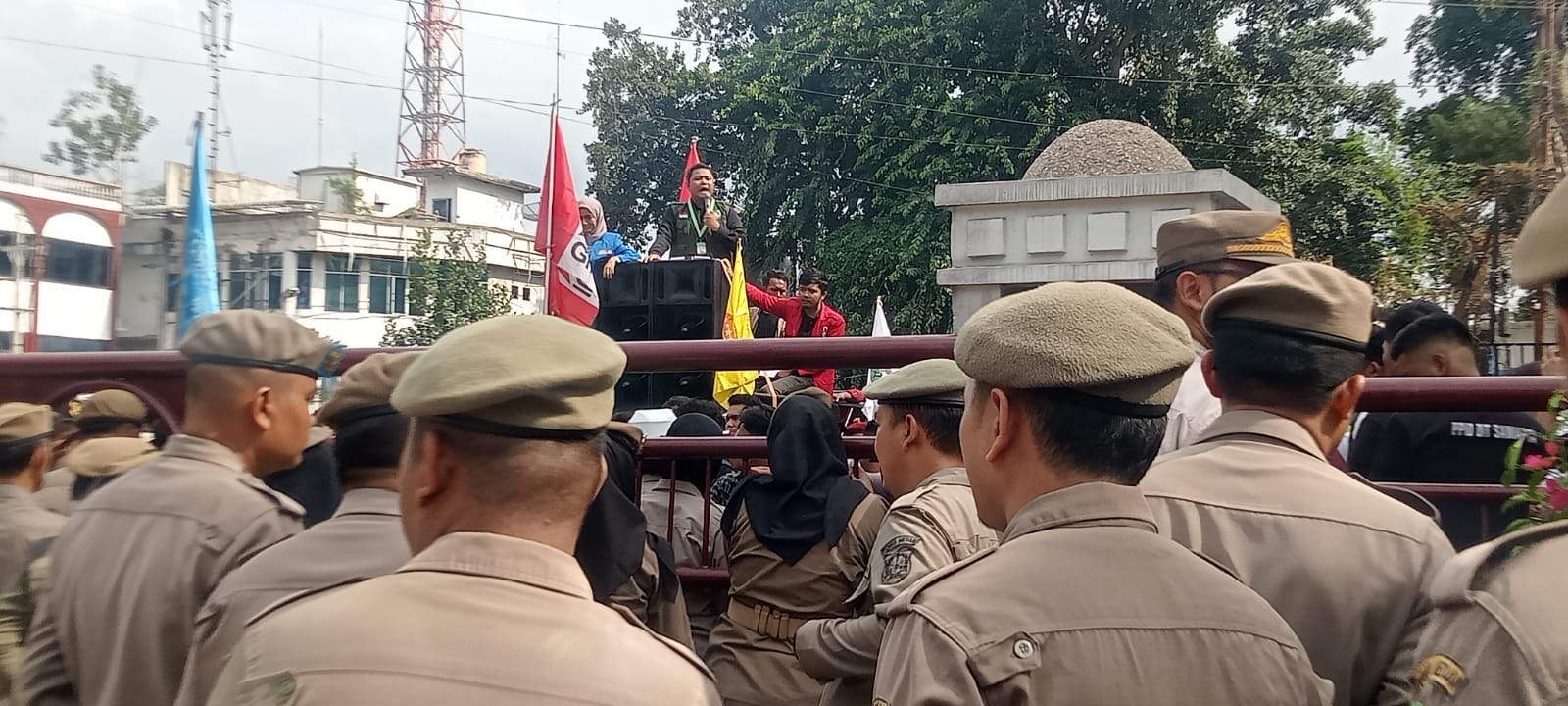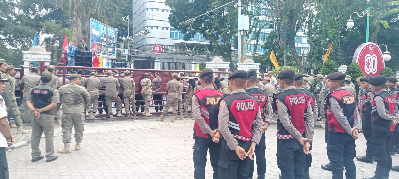 Area gerbang kantor dijaga untuk mencegah masuknya massa ke dalam area terbatas.