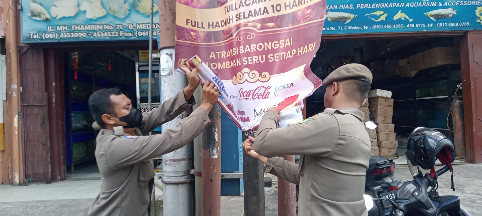 Larangan pemasangan umbul-umbul liar: Satpol PP Kota Medan menegaskan larangan pemasangan bahan reklame seperti umbul-umbul dan spanduk secara bebas di ruang publik, pohon, tiang listrik, median jalan atau tempat yang tidak resmi.