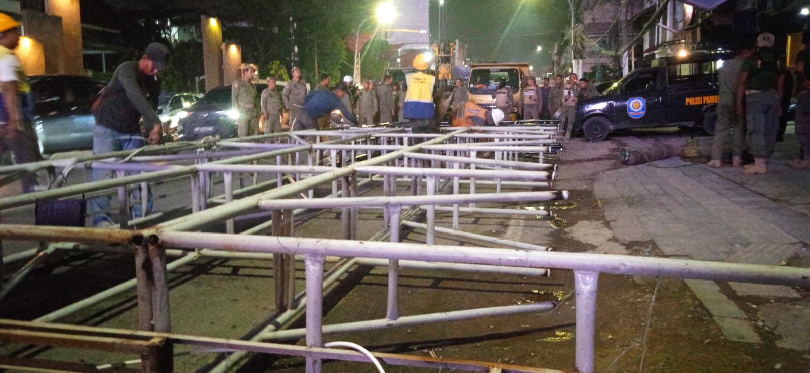 Pelaksanaan pembongkaran dilakukan secara terkoordinasi dengan melibatkan aparat penegak perda dan unsur pendukung lainnya, serta dilaksanakan dengan tetap memperhatikan aspek keamanan, ketertiban, dan keselamatan masyarakat. Proses pembongkaran berjalan tertib dan kondusif tanpa menimbulkan gangguan berarti terhadap arus lalu lintas maupun aktivitas warga sekitar.